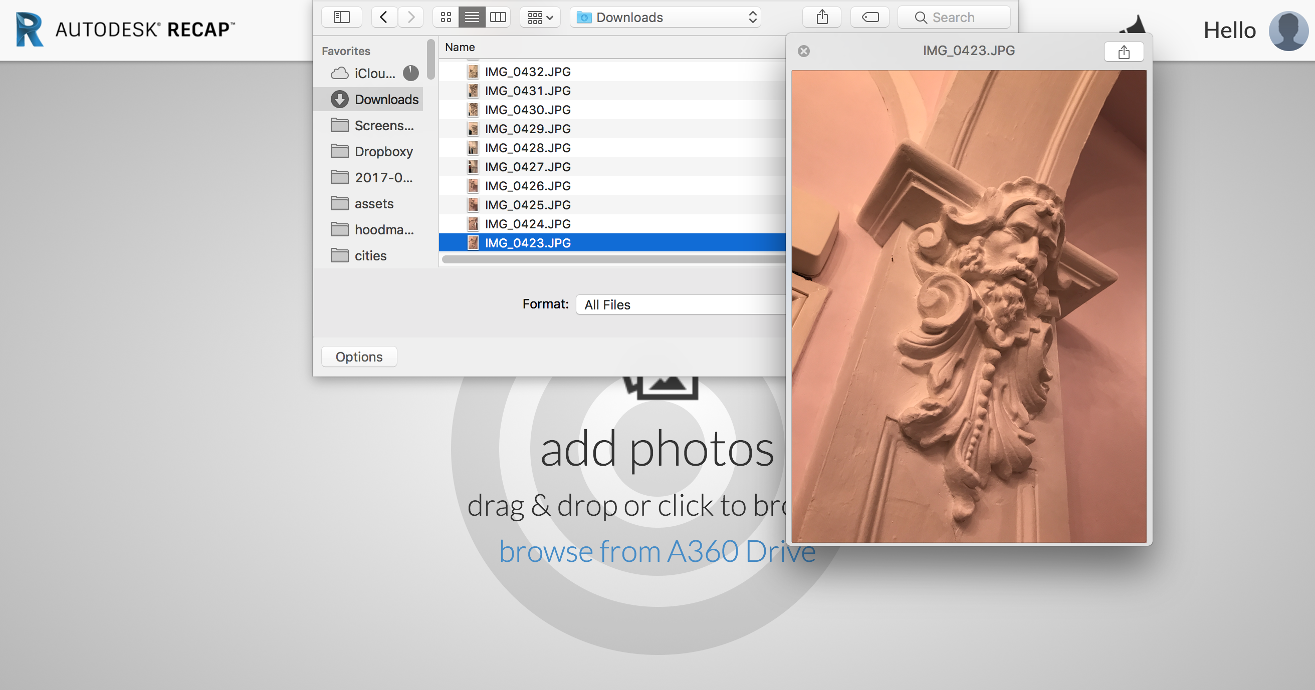 Third, upload those photos to Autodesk Recap 360. That’s a web app front end for Autodesk’s 3d processing servers. You’ll need to make a free Autodesk account, login and you can upload.