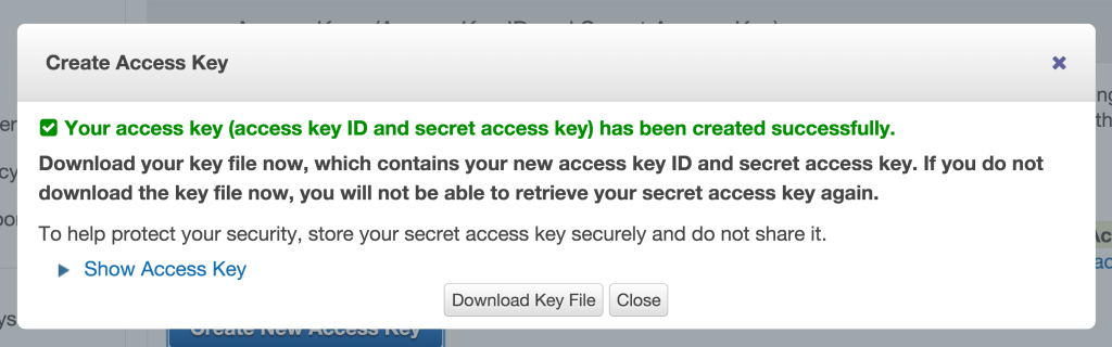 Click “Show Access Key” and save the Key and Secret code somewhere secure in a text file. You’re going to need this next.