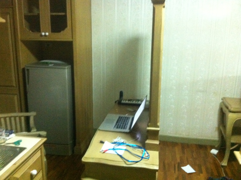 I was planning on working home half the time and at PunSpace the other half. But that plan quickly crashed. After paying for a WiFi card at the Hillside Condo 4 for 700 THB (about 20 EUR), I found out the WiFi was completely unstable. Using my MacBook’s signal strength detector, I found it was only somewhat usable in the apartment building’s hallway or in the kitchen — if I had my door open. With no other option, I spent a month with my entire desk cramped into my kitchen and the apartment’s door open. Just to get a connection with the speed of a 28k8 modem. A bare situation.