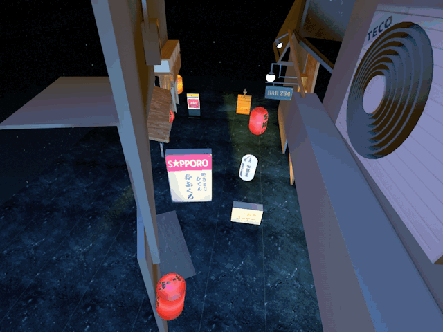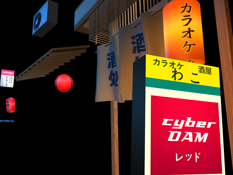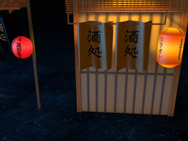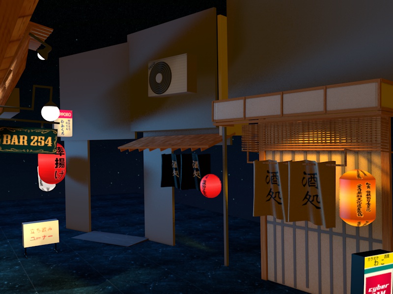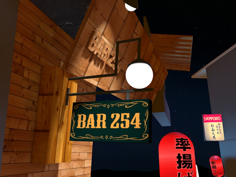 I then added two walls, a asphalt floor, the lanterns and the bar sign. I still used the textures straight from the photo so it looked very low-res. Like a 1996 video game: