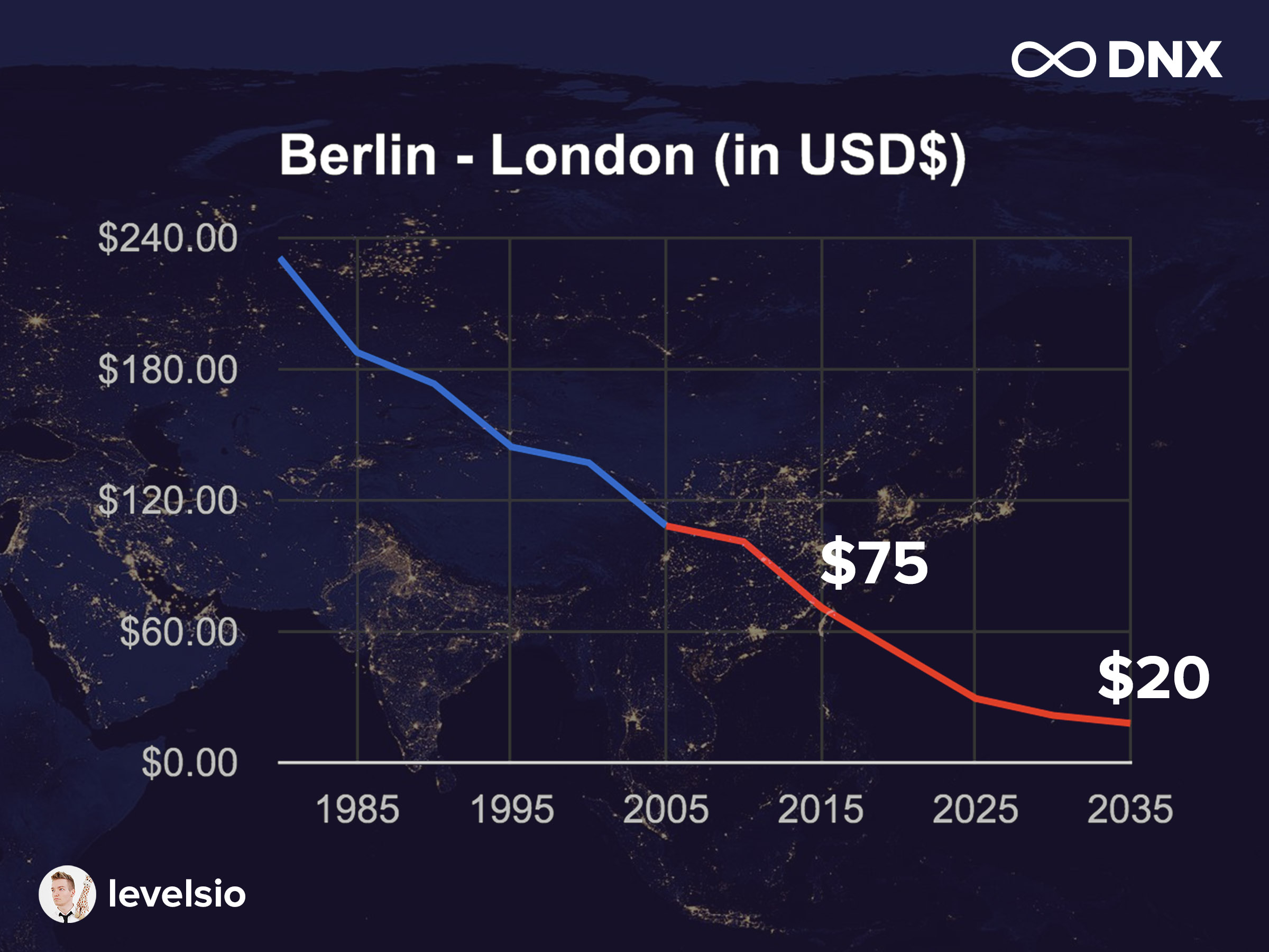 This is another cool chart. This is the Berlin-London, a price of a flight ticket. It’s about $75 now if you get a good ticket (Google, 2015). It’s going to drop to $20 (based on extrapolating data from Airlines for America, 2014). You’re like, “Okay. What does that matter?” Not much, but Shanghai, $600 in mid-season will be $150, sometimes $100 if you get, I don’t know, Ryan or EasyJet, because it’s going to fly from Europe to Shanghai, which means we can fly for super cheap everywhere. If you make $2000 a month, you can fly a lot for that money, and you can to Shanghai for the afternoon, go to Tokyo, then go back to London, then go to New York. You’ll be all over the world the whole month in the future, that’s what I think.