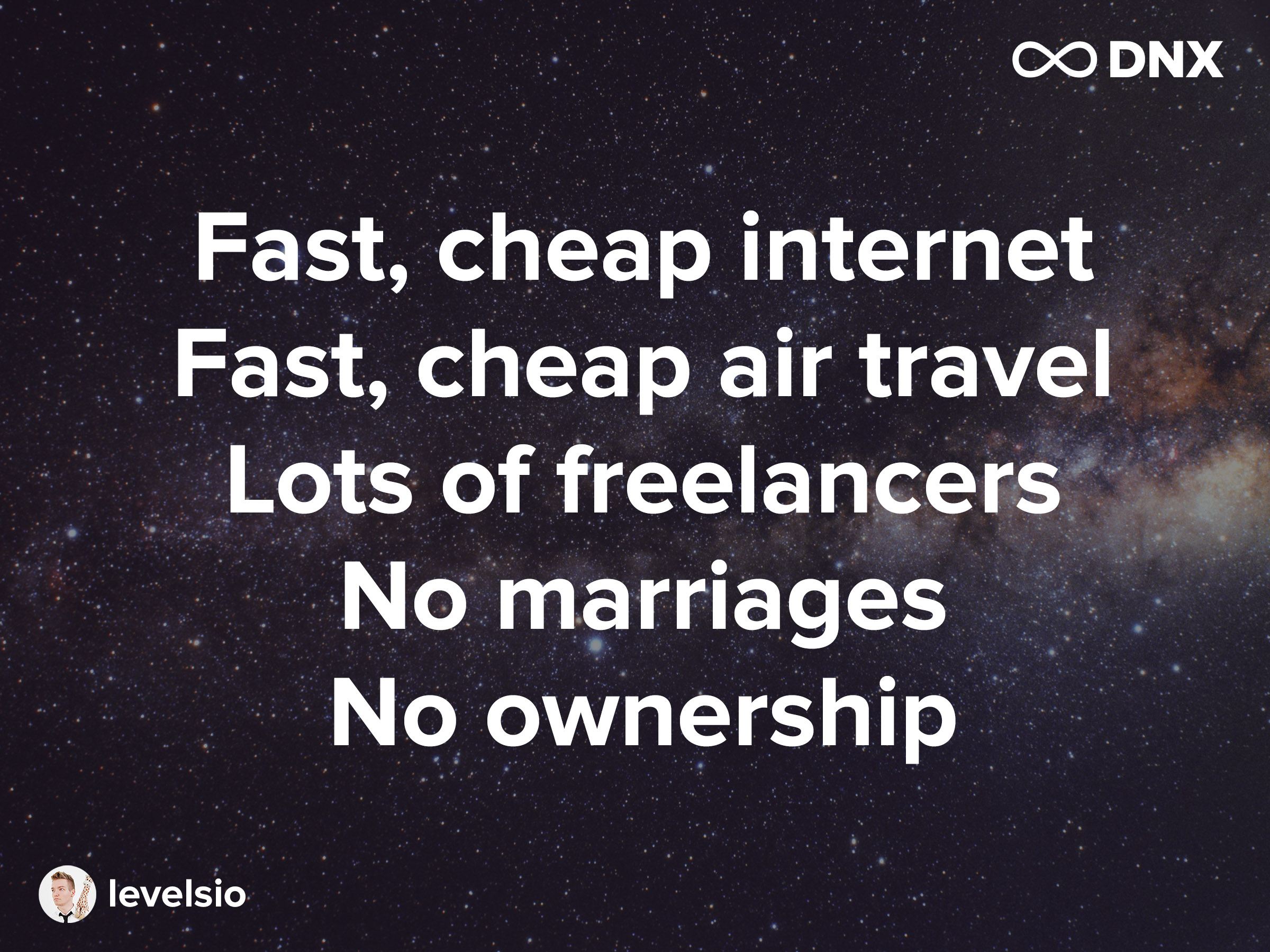 I just showed you all this data. To summarize, we have fast, cheap internet, fast, cheap air travel, so many freelancers, everybody’s almost a freelancer, nobody’s marrying (or less people, at least), and everybody’s dating everyone. There’s no ownership, so I only have a laptop in my back … Like nomads, we’ll move around the world. We don’t own anything. Most of us, what we do is rent, use Airbnb, or stay in hotels, we buy food, that stuff. We don’t cook ourselves so much.