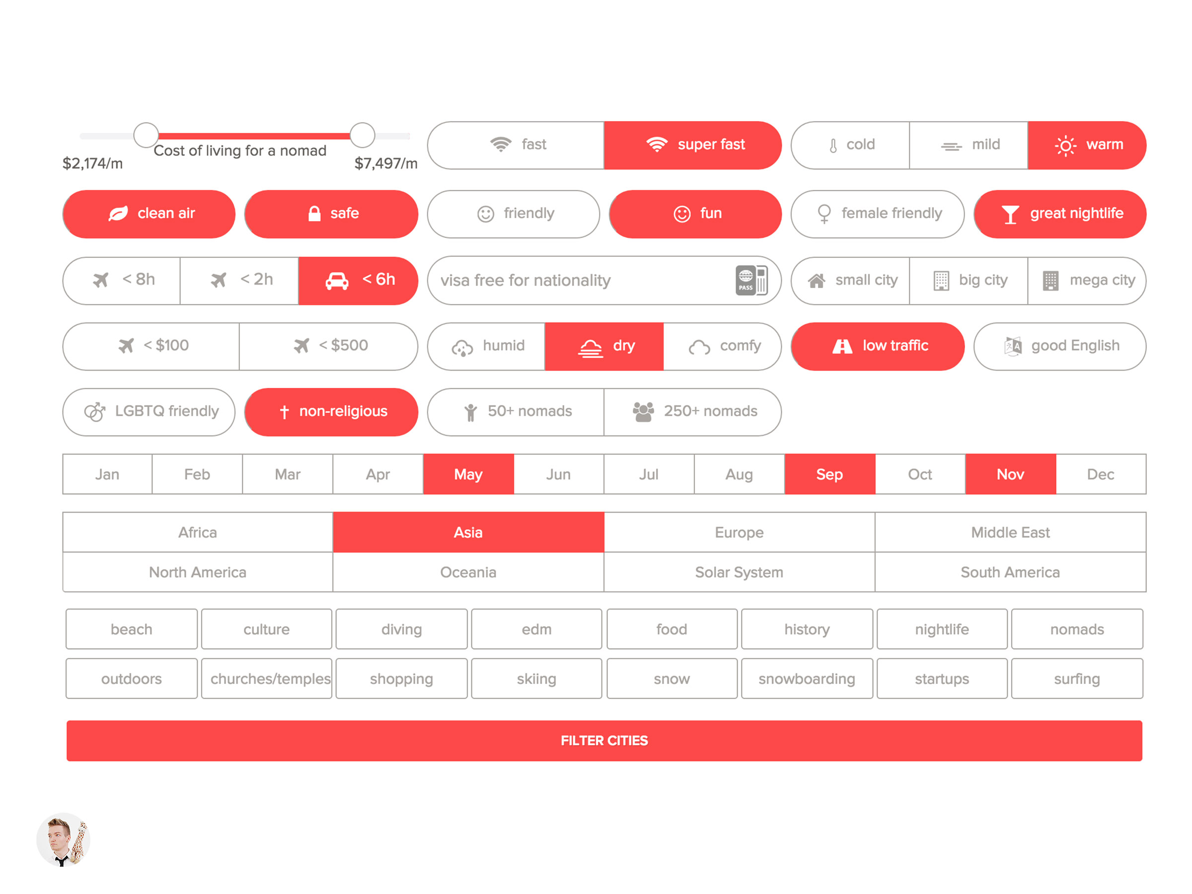There’s a lot of filters. You can select, “I want to go snowboarding and it should be pretty cheap,” and then it will find you cities to go to. This is how it looks.