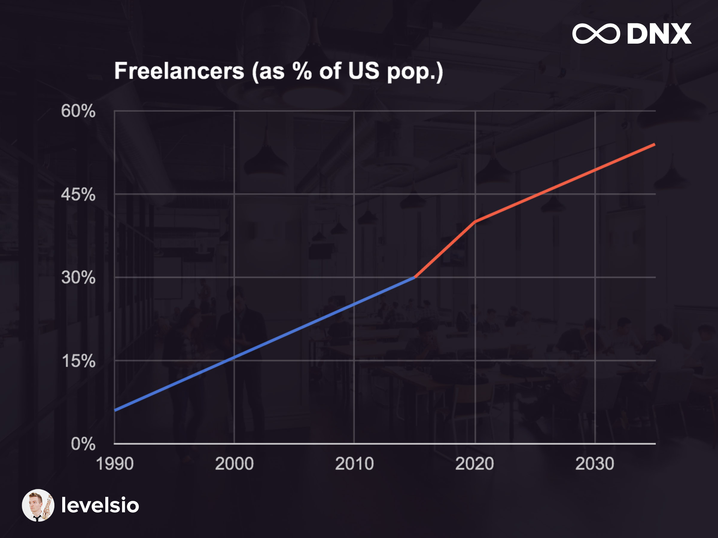 This is freelancers. We’re here now, 2015. This is America. It’s kind of representative of the general population (of the Western world). About 30% is freelancer (Freelancers Union, 2014), but the prediction is it’s going to reach 50%, and even higher in 2035. More than half of us will be freelancers, which is crazy to think about. It has to do with job security as well. A lot of people don’t have jobs anymore, and it’s really hard to get hired these days as a graduate.