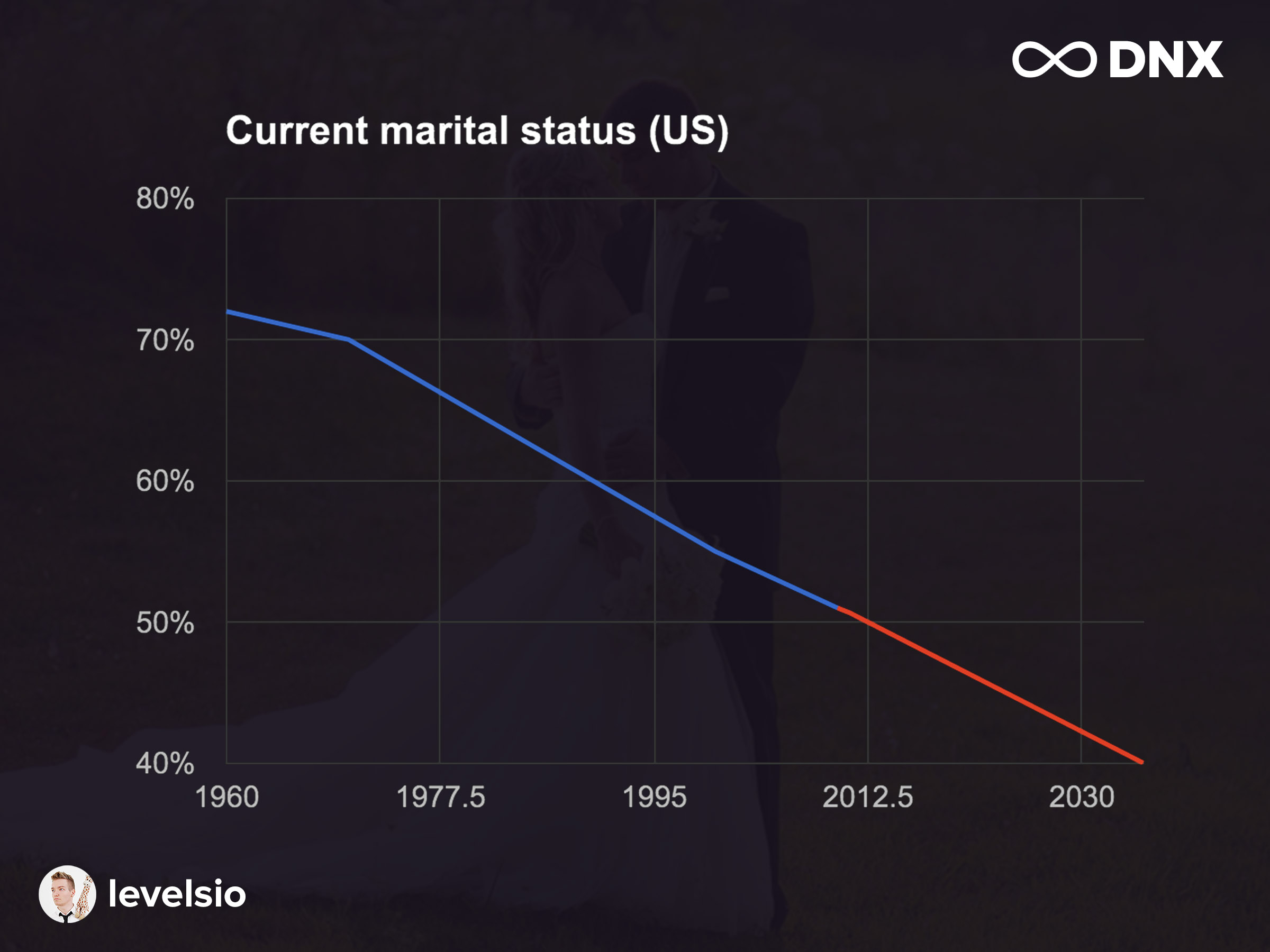 This is another thing. You’re like, “Why is he talking about marriages?” Well, current marital status in America, and the West, is decreasing rapidly. In 2035, less than 40% of the people around us will be married (Pew Research Center, 2015). That’s crazy to think about, because it used to be the traditional thing, getting married, getting a house, getting children. There’s a lot of overlap with digital nomads here. The previous speaker spoke about it. We’re trying to find a different kind of life, and this whole generation is doing that. It means, also, we’re marrying less. We have more relationships. That kind of stuff.