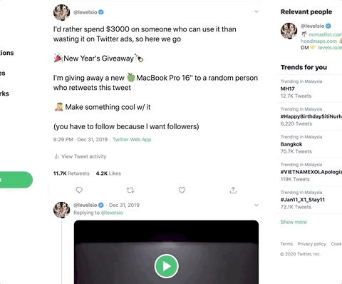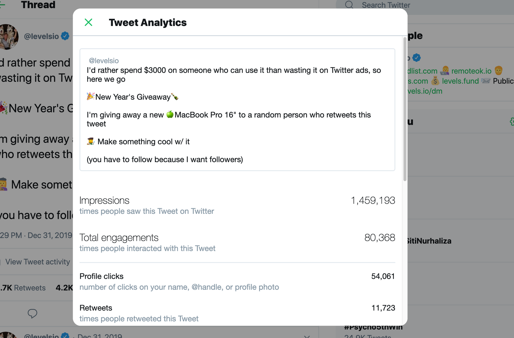 All that is nice for your vanity metrics but doesn't do much for your business. In fact, both sales and volume on my main project Nomad List (which I link to from my Twitter profile) were lower on Dec 31 - Jan 1 than the same weekdays a week before. That could be NYE of course. I didn't see much effect on revenue. That's logical though since again people just want a free MacBook 16". I'd not click through either, haha.