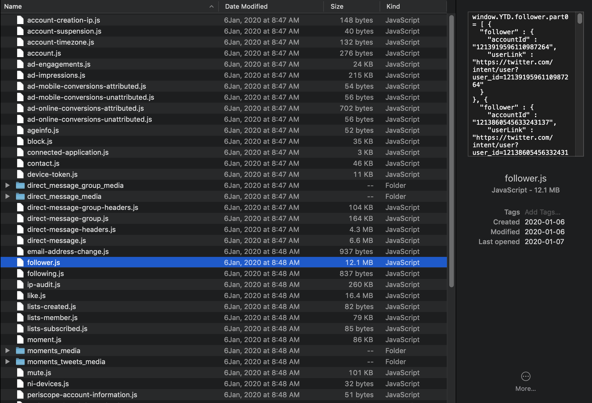 Where would I get my followers though? I could use the API but that'd takes ages with pagination I think. So I exported my data.