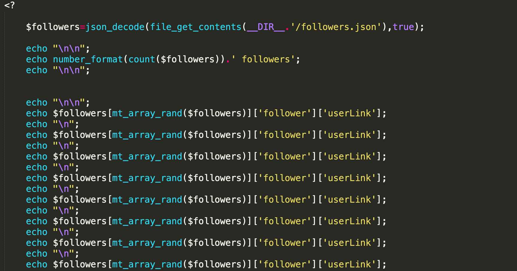 I then made a PHP script (I put it on Github here) to pick a list of random followers, so I could open their profile in my browser and see if they had RT'd the giveaway tweet: