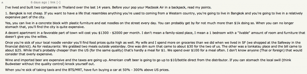 I’m not against negative top comments per se but they should at least be factual. Most commenters confirmed that the top comment here was far from factual and half of it could be contributed to not actually reading my post carefully (e.g. I explicitly mentioned Bangkok as a bad place to live since it’d be too expensive which the commenter seemed to have not read). The second highest comment was factual but was overtaken by the top comment at the end of the day.