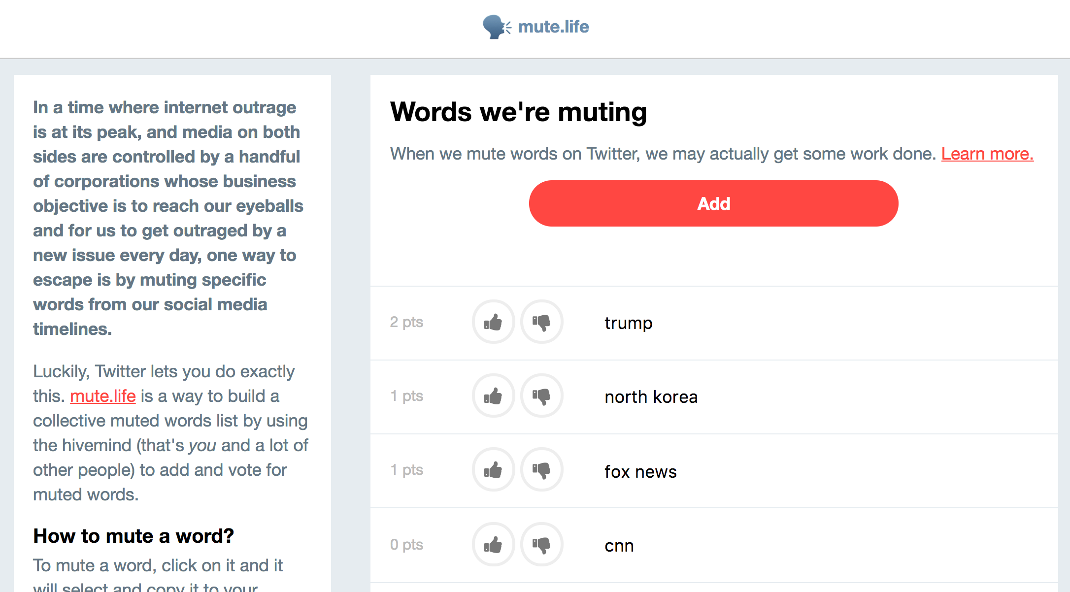 It’s a free web app that lets people add muted words and vote for them. You click a word and it brings you to Twitter or Facebook to mute it. It also has a bookmarklet that auto blocks the Top 100 muted words: