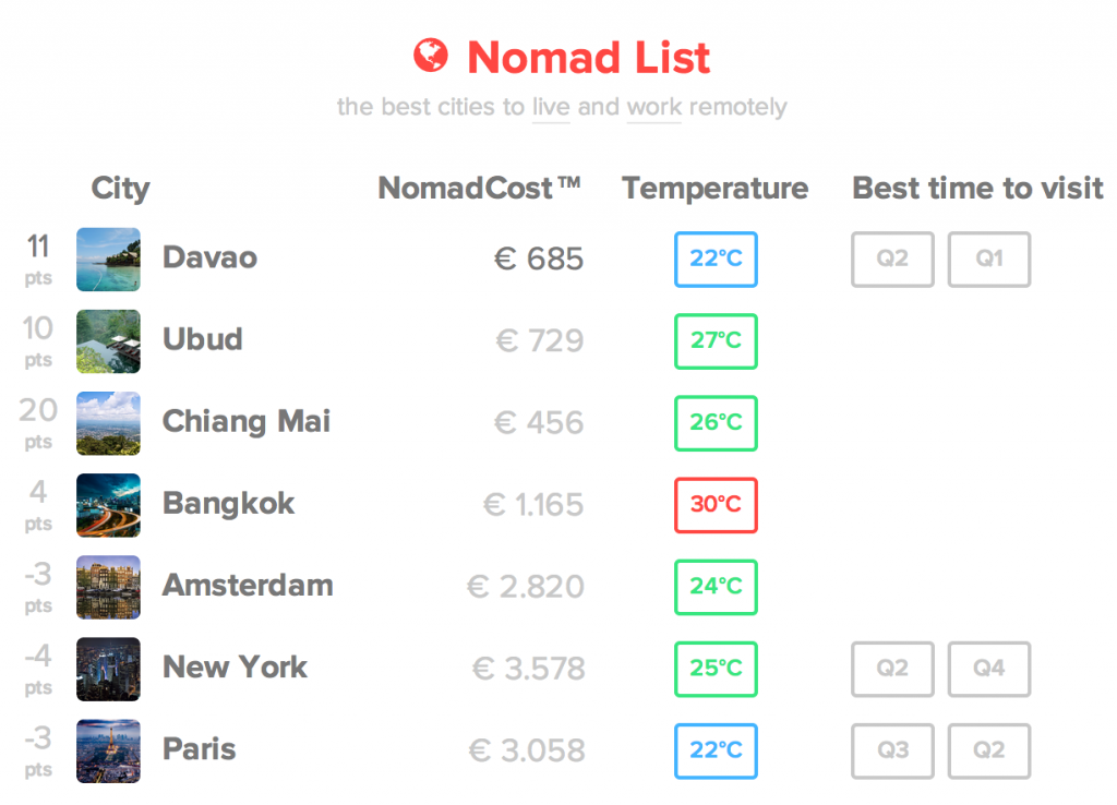 While traveling and working from different places in the world I met lots of other people doing the same thing. They were freelancers, remote employees or startups founders. I knew some cities had entire communities doing this like Chiang Mai, but it was hard to figure out what other cities would be suitable. I heard for example some people trying to do this in Medellin in Colombia and Ubud in Bali, Indonesia. But what other cities? I thought we needed a city index for remote workers.