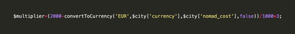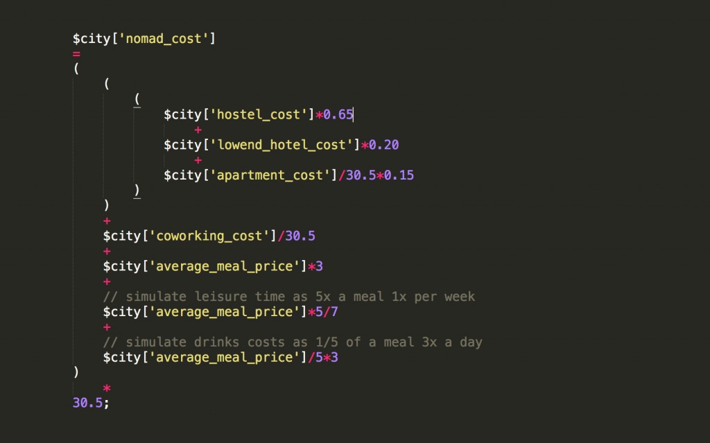 The list featured cost of living. But this cost of living would have to be based on a typical nomad though. How do they live? Taking cues from myself, I stay in a single private room in a hostel or cheap hotel, sometimes rent a 1-bedroom apartment if I stay longer. I eat outside 3 times a day (cause I don’t have a kitchen), have drinks with food and will go out maybe once a week. Having only meal prices, I simulated the other ones by making it a % of a basic meal’s price, which works about right for now. I know there’s always more stuff to pay for, but these are the very basics. To make it official, I called this NomadCost.