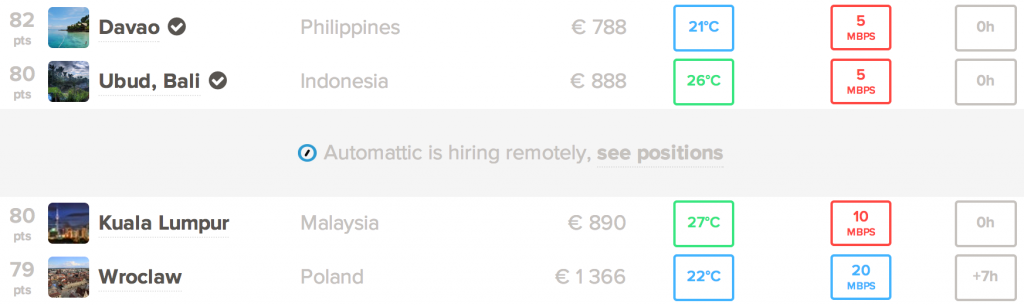 Then I added different indicators to the score, like temperature. Since most nomads like warm weather, this affected it positively. That’s not perfect though since some people like to e.g. snowboard and work, but this works for now: