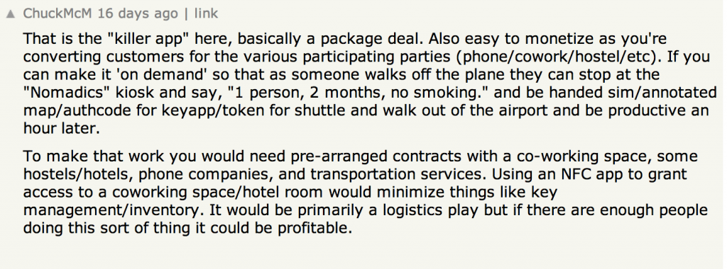 I had some business models I wanted to test in the coming months though: 1) Selling city-specific guides to set up as a remote worker, stuff like where to work, where to stay, how to stay safe, where to meet other nomads, how to legally register a business etc. 2) Launching a NomadKit bundle for remote workers they can get before they land in a new city. Think like before flying to Bangkok, you can get a SIM card, coworking space pass, hotel near the space, nomad guide, and transit card. Hacker News also believes this is the “killer app” here: