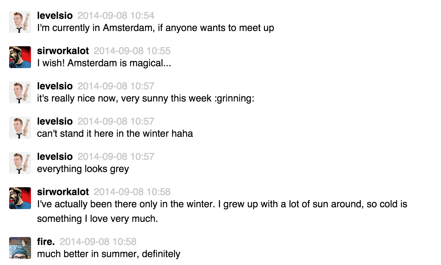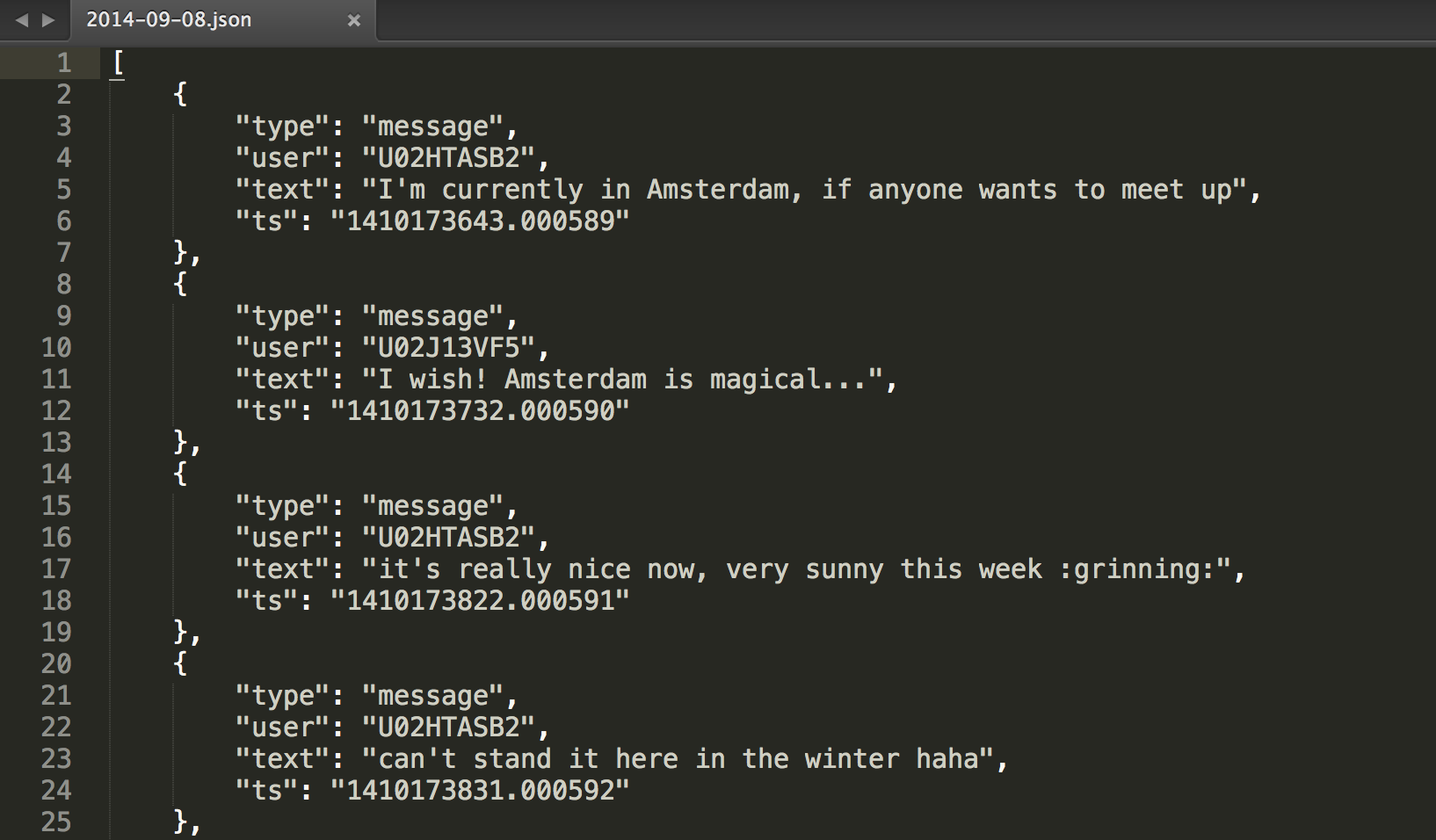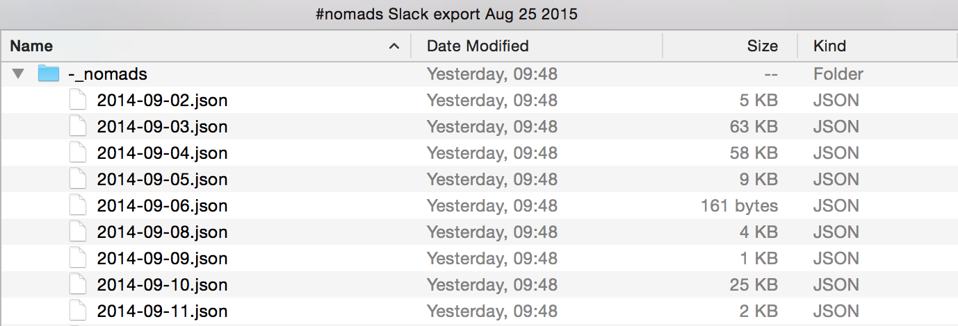 Also all usernames are replaced by user ids, and there’s no user images to be found in the chat logs. They’re in a different file called users.json. All channel names are also replaced by channel ids, which can be found in channels.json.