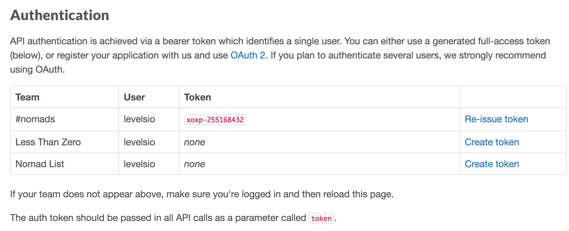 I tried using the API token anyway. You can generate a token for your team on the Slack API page: