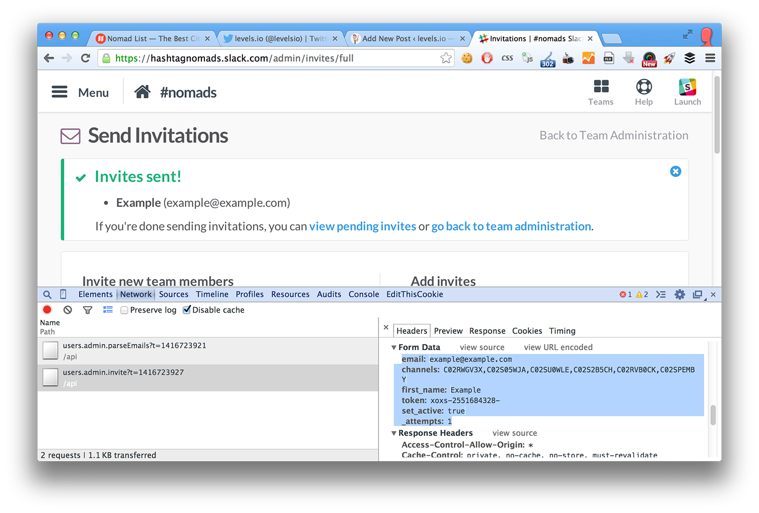 So it ends here? No. Let’s sniff the POST data when we invite people on Slack’s web interface: