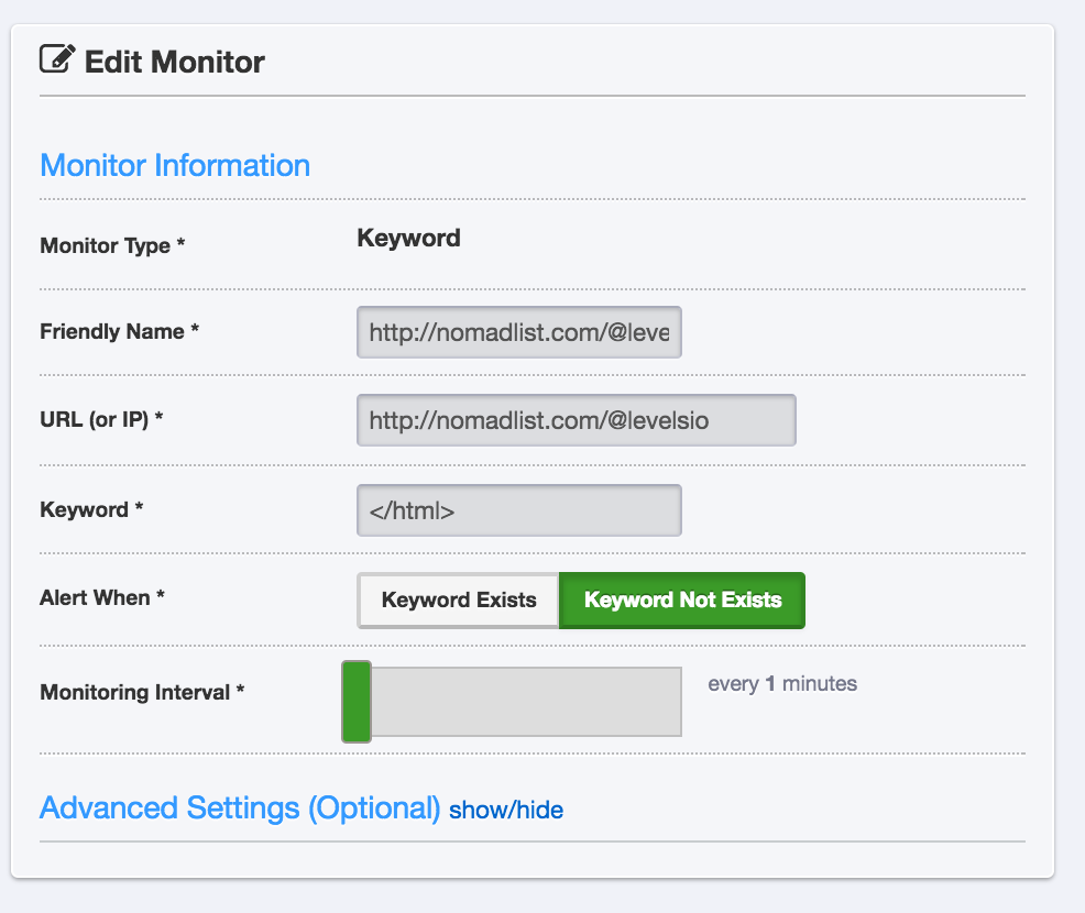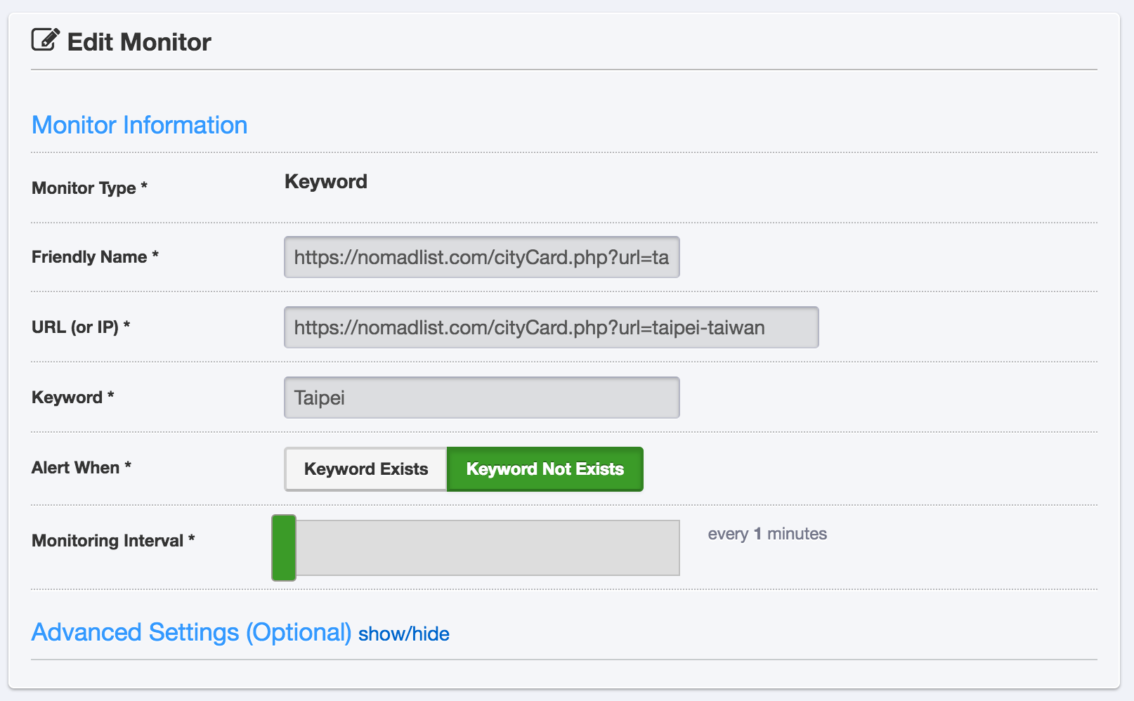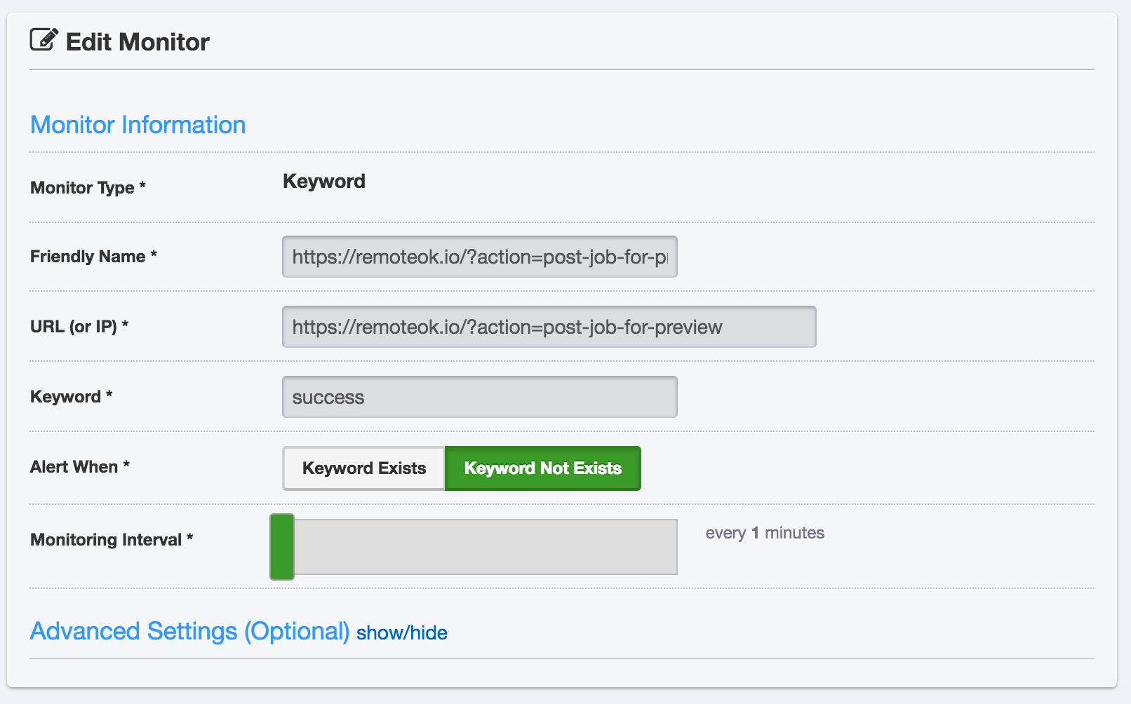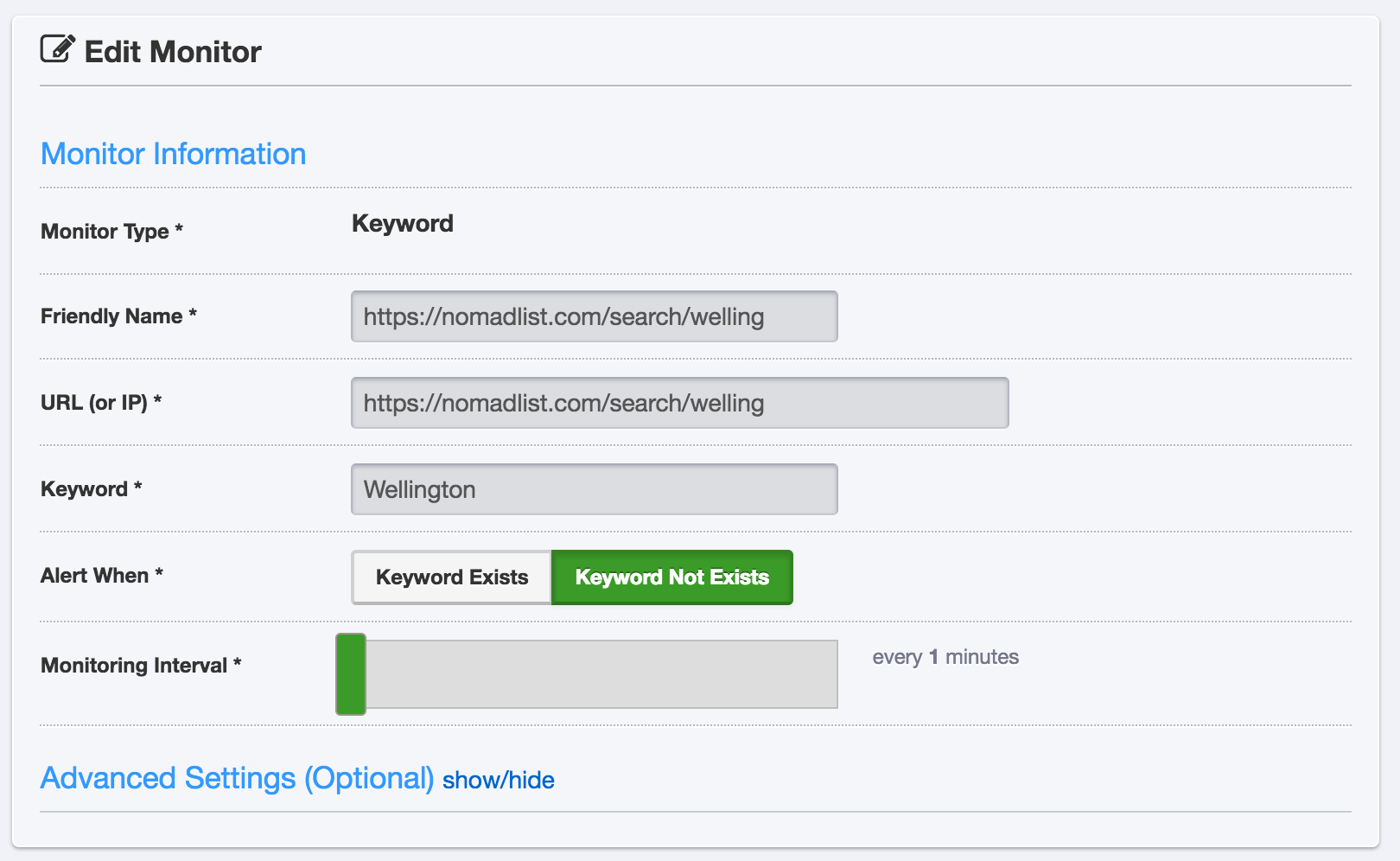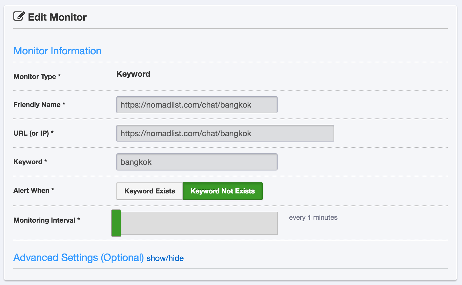 I tried all these unit testing suites, and like always, it’s all just too complicated and convoluted for me. So I thought, why not try something simpler. I was already using an app called Uptime Robot which pings my servers every few minutes to check if they’re up. But they also had a feature called “Keyword” which opens a page every minute, checks if a keyword that you specify exists. And if it doesn’t alerts you.